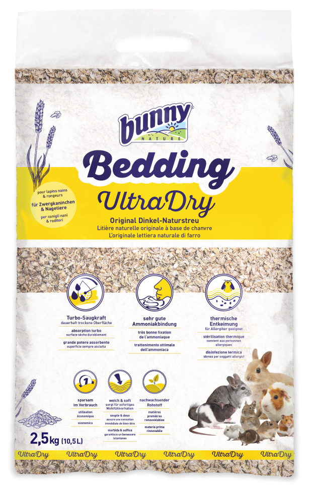 Насипи и се чувствай по-добре! Новата BunnyBedding Ultra Dry се състои от качествена спелта, специално подготвена, за да се чувстват животните комфортно. BunnyBedding Ultra Dry е с високи абсорбционни свойства и приятно мека. Идеална постеля за много от дребните бозайници.